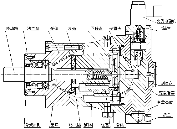 主體部分(參見結構剖)由傳動軸帶動缸體旋轉,使均勻分布在缸體上的七個柱塞繞傳動軸中心線轉動,通過中心彈簧將柱滑組件中的滑靴壓在變量頭(或斜盤)上。這樣,柱塞隨著缸體的旋轉而作往復運動,完成吸油和壓油動作。